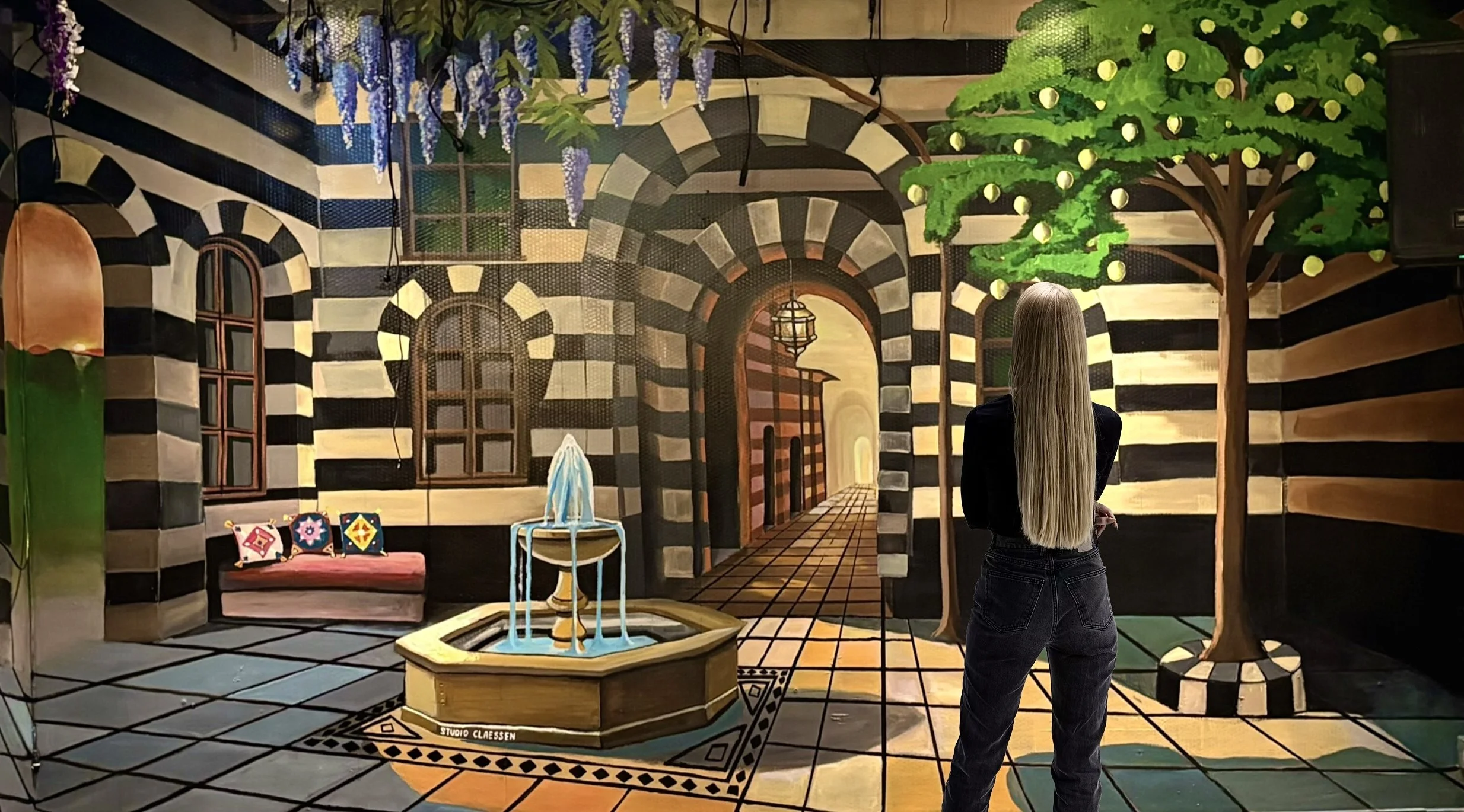For the Syrian restaurant Bab Touma in Oslo, Studio Claessen created a 3.5 x 2.5 meter hand-painted trompe l’oeil mural that transforms the interior into an imagined courtyard in old Damascus.